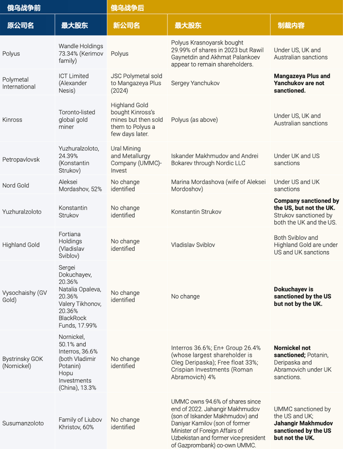 ▲ 俄罗斯前十大黄金生产商此外,Susumanzoloto的所有权也发生了变动,该公司是俄罗斯远东地区的重要生产商,现在由Makhmudov家族控制。在这些变动中,黄金矿山及相关生产资产经历了重新分配。例如,Mangazeya从Highland Gold公司收购了Taseevskoye矿山,而Highland Gold自俄乌战争以来在该行业的持股比例有所增加。