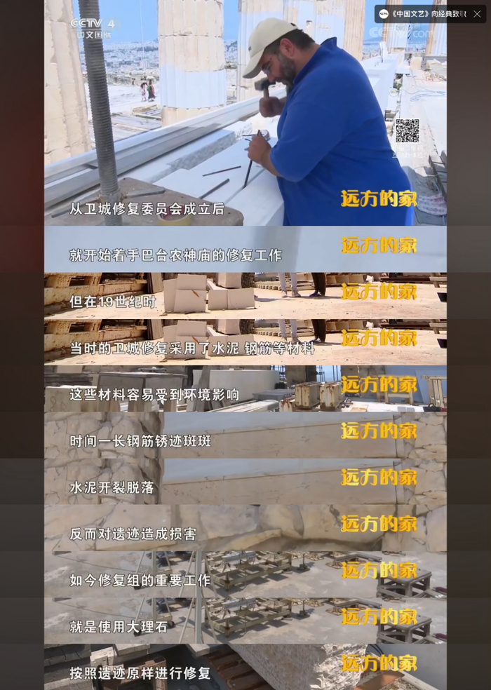 此外,罗萨莉亚在节目中还提到,自1992年修复工作正式开展以来,帕特农神庙的受损墙壁和柱体已经陆续得到复原。根据她当时的估计,神庙的全面修复预计还需要十年才能完成。