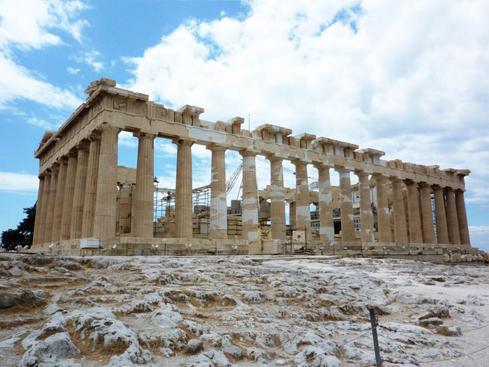 历史上,雅典卫城曾多次遭遇战争、侵略和人为破坏。1687年,威尼斯人与土耳其人交战时,帕特农神庙被用作火药库,并在一次爆炸中严重受损,顶部和围墙全部被炸毁,现仅留一座石柱林立的外壳。神庙采用的八柱式多立克柱式建筑风格仍然清晰可见,东西两侧各有8根柱子,南北两侧则各有17根。