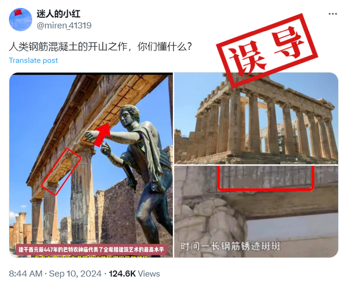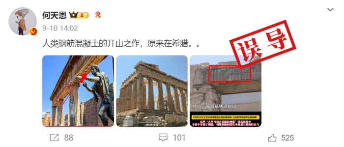 近日,社交平台流传一则说法称,希腊雅典卫城帕特农神庙在屹立了2400年后竟然露出了钢筋,并称其为人类钢筋混凝土的“开山之作”,暗示该古建筑为后期伪造。相关说法附有三张建筑物的图片,其中两张显示建筑物有钢筋裸露的迹象。