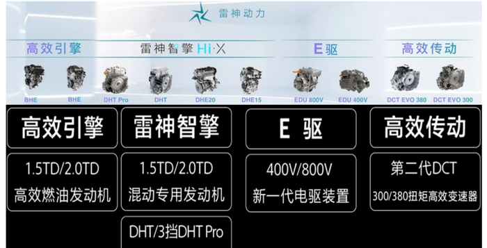 吉利动力实现从 0到 1的突破,始于吉利首款自主研发的发动机 MR479Q在宁波成功下线。2021 年 10月底吉利汽车集团发布动力品牌——雷神动力,开启吉利动力 4.0时代。模块化产出一系列产品矩阵包括:1)雷神智擎 Hi·X混动系统;2)高效传动;3)高效引擎;4)新一代电驱装置“E 驱”。E驱“顾名思义”面向纯电动车型,并包含400V和800V两种纯电架构,800V纯电架构上能见到碳化硅控制器、油冷电机等技术,最大功率会超过475kW,综合效率大于92%。控制智能化方面,吉利开发的动力域控制软件涵盖了发动机、变速器、电机、电池、能量管理、热管理等各类应用。未来,吉利动力域还将通过基于服务的 SOA 软件架构,通过 API(应用程序接口)开放给生态伙伴,支撑动力总成系统全面数字化转型。雷神智擎 Hi·X致力于做到动力与效率、智能与安全、性能与 NVH三大平衡,而不是为了节油牺牲动力、舒适性等。