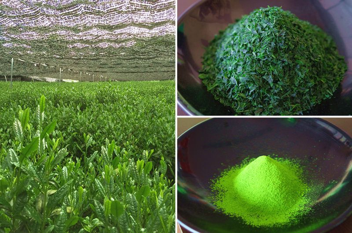 采摘的茶树鲜叶在当日进行杀青与干制,每片鲜叶的叶柄、叶脉都被剔除,只保留叶肉部分在恒温下蒸干。使用“蒸青”的方式,虽香气不及中国绿茶用炒锅炒杀青浓郁,但因杀青温度高、时间短而更好保留了叶绿素,使得茶叶和茶汤都更绿。