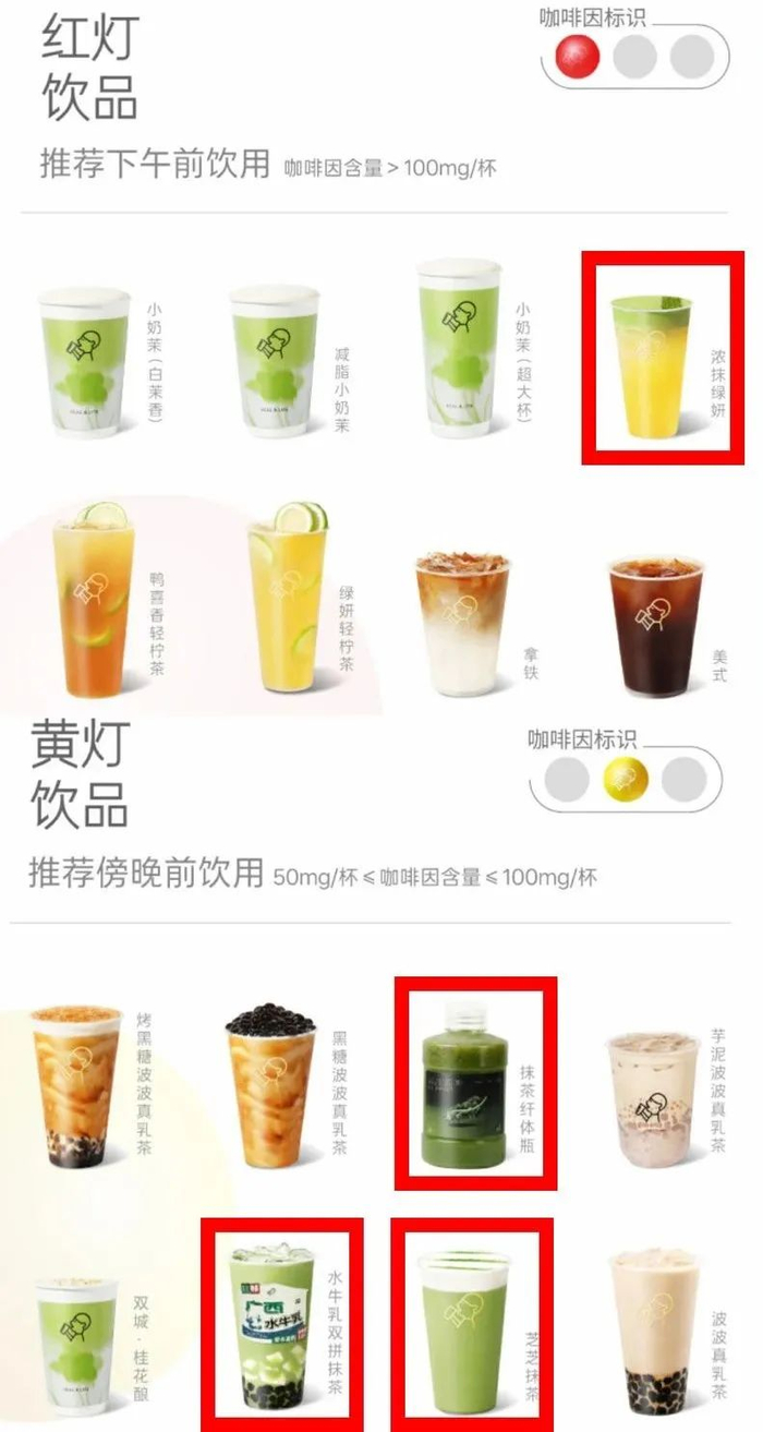 芝芝抹茶、抹茶纤体瓶、水牛乳双拼抹茶都属于咖啡因黄灯饮品,每一杯的咖啡因含量在50~100毫克。