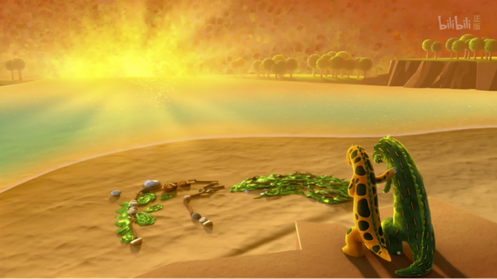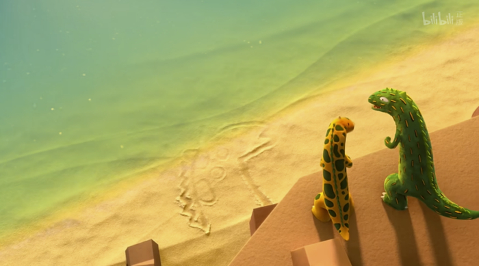 具体而言,本片的剧情中,也有不少是“向外”延展的——动画中不少令人印象深刻的故事,都是从角色们对其所在的世界的探索和冒险延伸而来。观众不仅可以体会到家庭剧一般的温暖,也能在同时领略到这个远古世界的点点滴滴。
