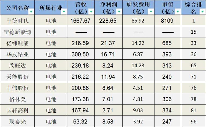 储能电池前两强:宁德时代和亿纬锂能均入选新能源100强。