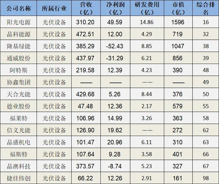光伏核心产业链入选企业8家,分别为阳光电源、晶科能源、隆基绿能、通威股份、阿特斯、协鑫集团、天合光能、晶澳科技。