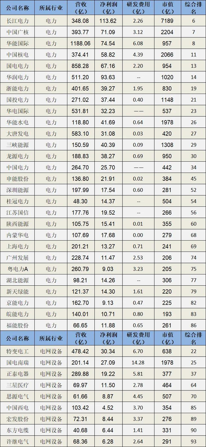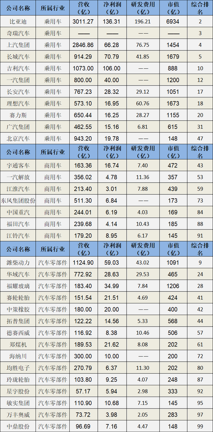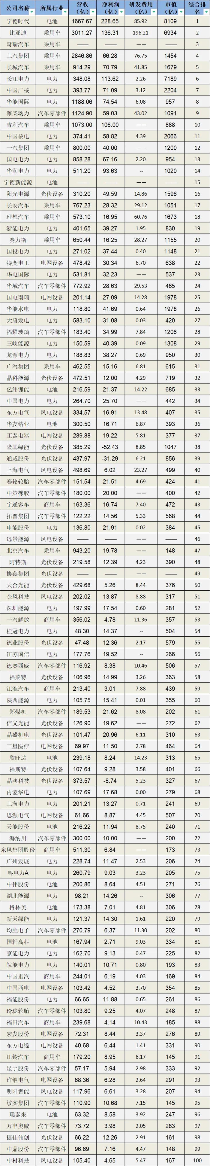 综合排名前十强名单为:宁德时代(锂电)、比亚迪(汽车)、奇瑞汽车(汽车)、上汽集团(汽车)、长城汽车(汽车)、长江电力(电力)、中国广核(电力)、华能国际(电力)、潍柴动力(汽车零部件)、吉利汽车(汽车)。