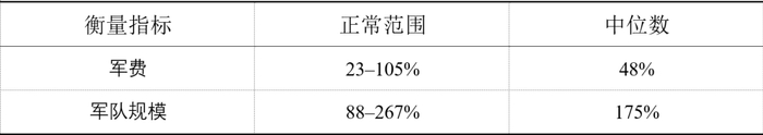 除了人口和经济指标,作者还探讨了衡量国家军事实力的指标。学者们通常会采用与常规军事力量投射相关的两个常用指标以衡量国家的军事力量,即国家的军费开支和能动员的军队数量。