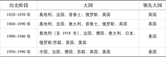 在以上研究的基础上,该文创建了一种比较国家间实力的归纳方法。首先,作者参考了政治学者和历史学者较为公认的不同历史时期的大国名单,将其作为基于物质和非物质实力衡量大国实力的基础事实(见表1)。