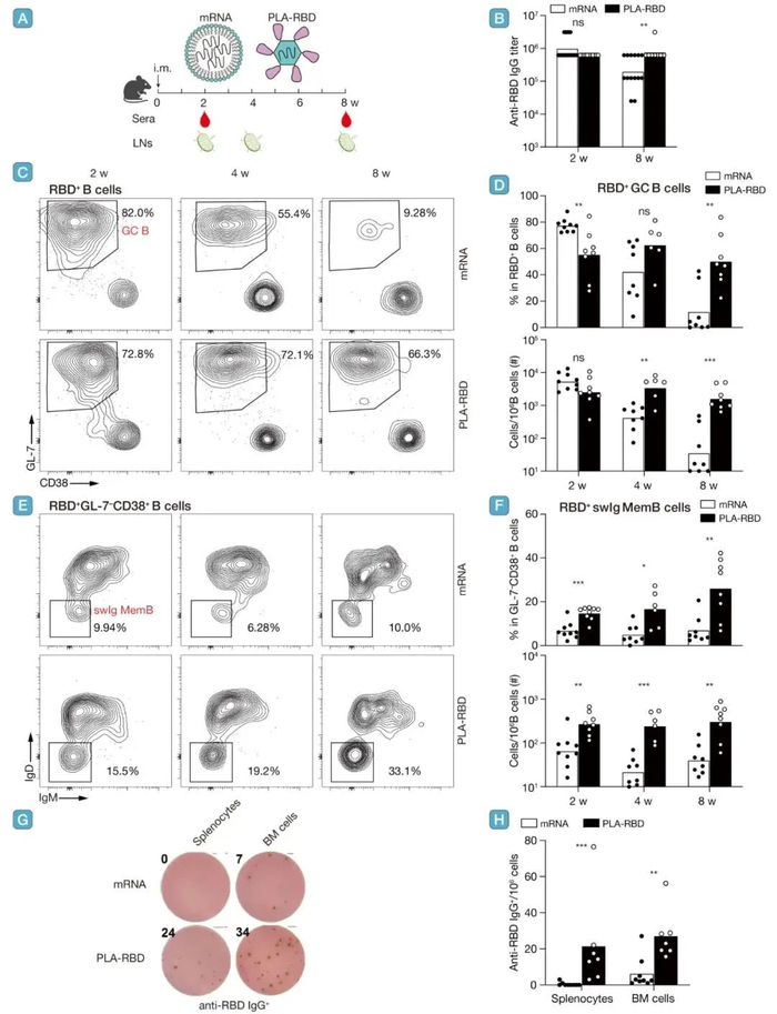 图3 重组RBD二聚体疫苗需反复免疫才能引发充分的免疫反应mRNA疫苗是COVID-19疫情中异军突起的新技术路线疫苗。我们观察到mRNA疫苗在初次肌肉内接种后,就能够诱导高水平的IgG抗体应答和强烈的GC反应。但是,我们发现mRNA疫苗产生长寿命抗体分泌细胞和记忆B细胞的能力显著弱于PLA纳米颗粒疫苗(图4)。这是个非常意外的结果,因为免疫记忆形成能力往往被认为与疫苗免疫原性或者刺激GC反应的能力直接相关。但是,这个结果却与COVID-19 mRNA疫苗免疫保护效力迅速下降相符合。类似的,最近在临床试验中,Moderna开发的RSV mRNA 疫苗效力相较于两种其他重组蛋白疫苗也下降更为迅速。这些现象都提示mRNA疫苗虽然能够很好地诱导的GC反应,但是在生成持久免疫记忆方面存在缺陷。为什么mRNA疫苗的GC反应会产生这样的效果?相关的具体免疫机制有待进一步探索。