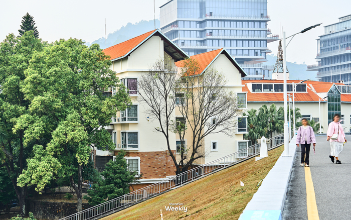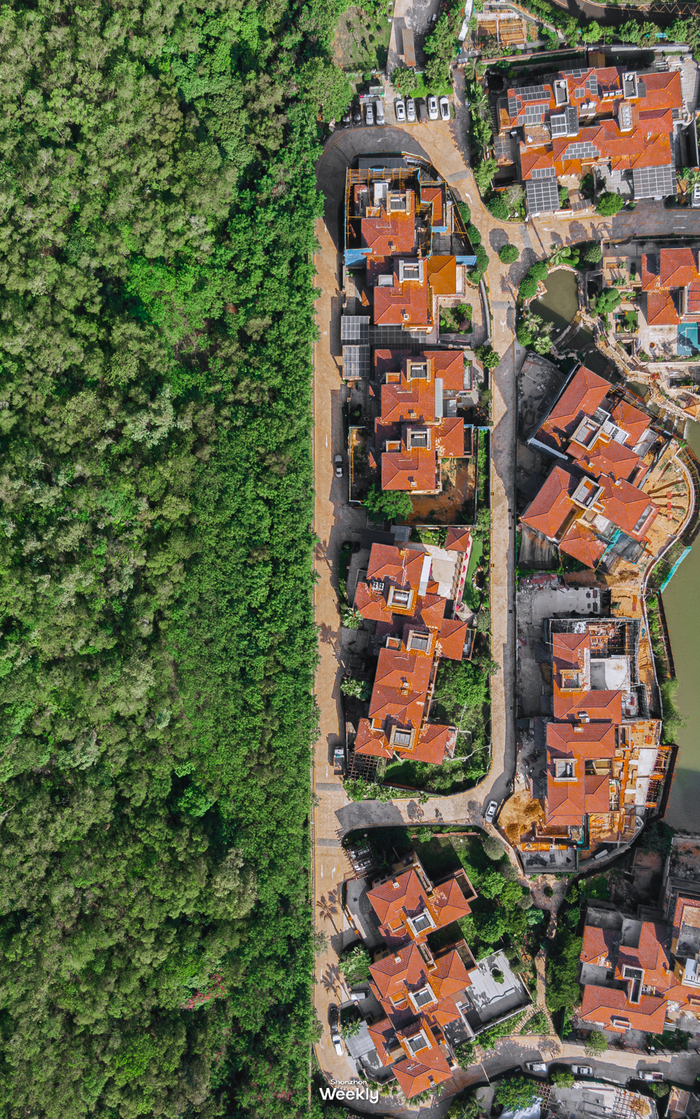站在尖岗山的下山小路上,向下俯瞰,整个别墅群一览无遗。每当傍晚时分,有夕阳的时候,放眼望去风景则更加美丽,躲在山后的别墅群像是镀了一层金光,此时此刻,这里就是梦中海滨城市的模样。