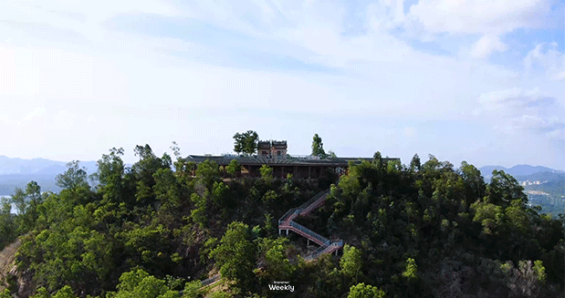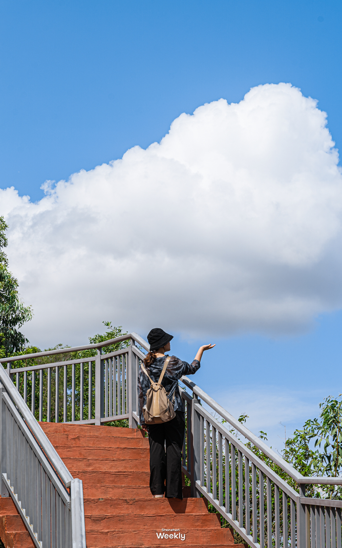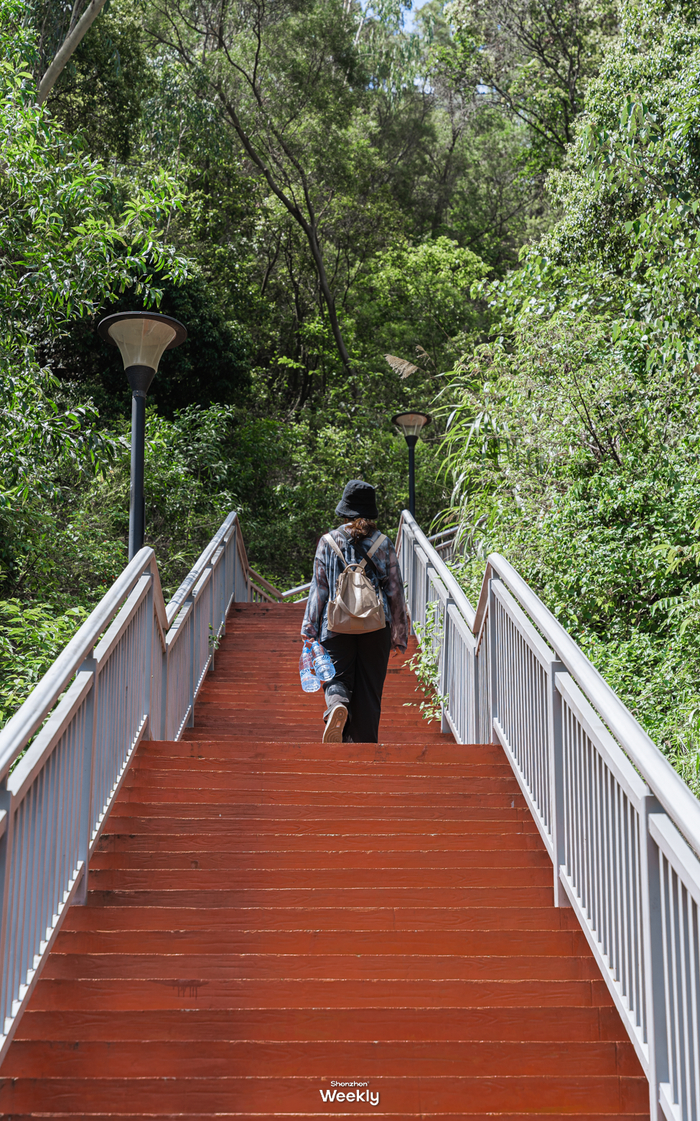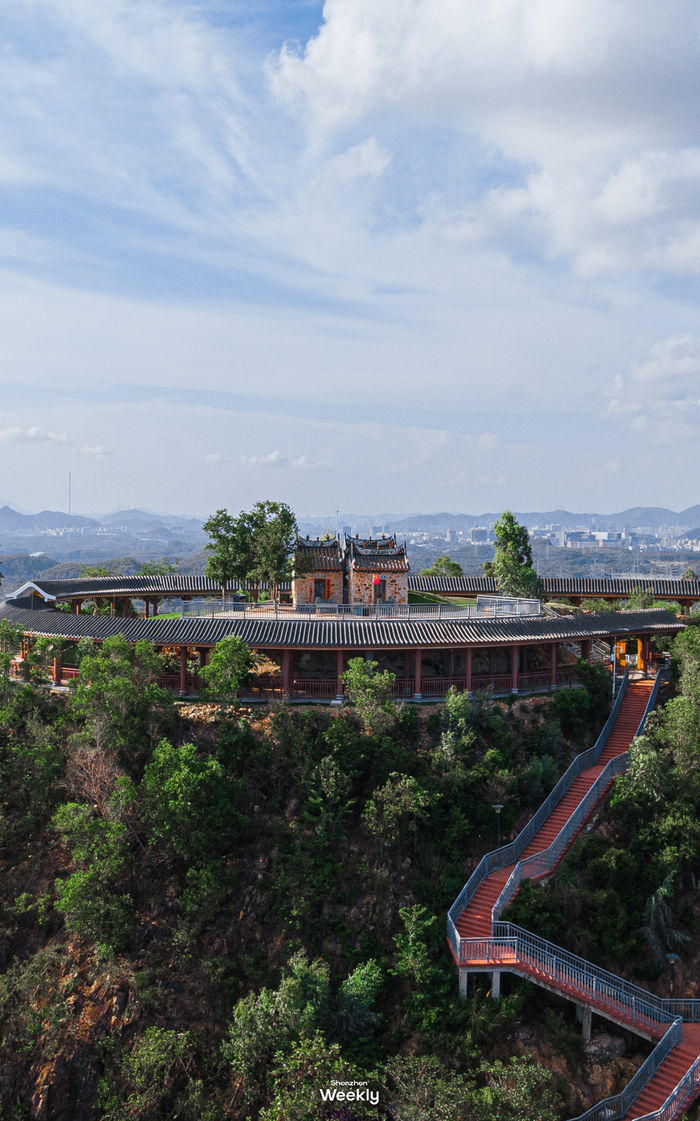整体海拔不高,所以可以轻松登顶。这里有充满神秘感的山顶围楼,还有一片“宫崎骏草坪”、古风的百米红木连廊可供人休息,360度俯瞰大半个宝安区......一步一景色,如果时间充裕的话,真想在这里浪费时间~