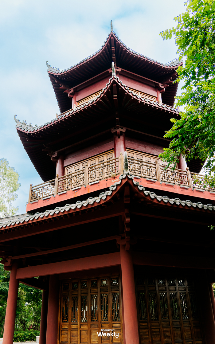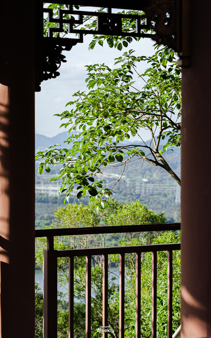 尖岗山海拔202.9米,沿阶梯盘旋而上,半小时足以登顶。山顶不仅有充满神秘感的围屋、红木连廊围绕的古庙,还可以目睹大片橙色房子的深圳版“小青岛”,远眺则能更近距离地望见铁岗水库。