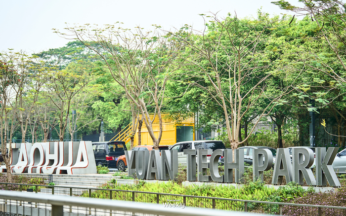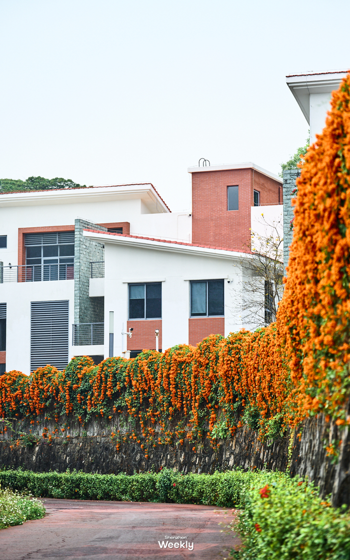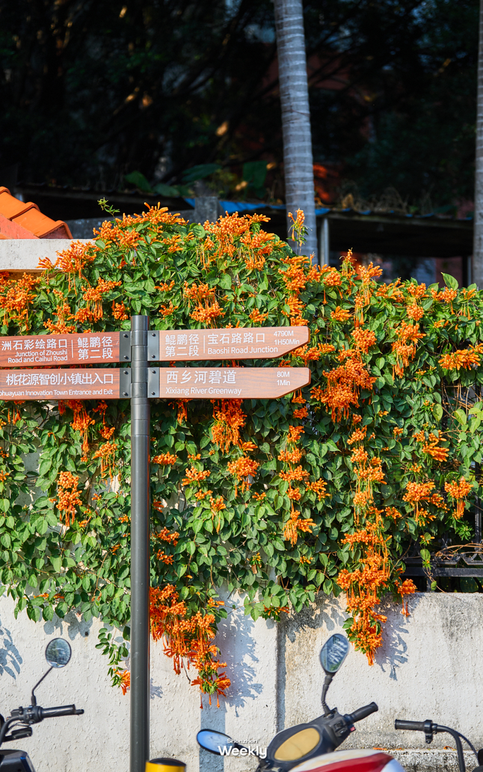 深圳最近爆火的「炮仗花花海」当属在桃花源智创小镇,从铁岗水库门口出来直走不一会儿就能发现它的存在。
