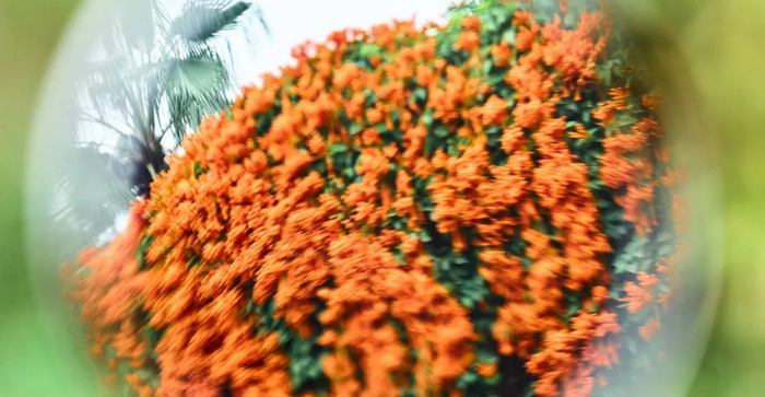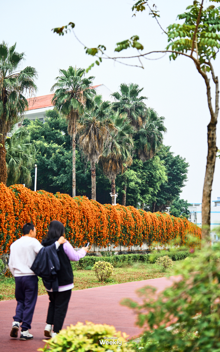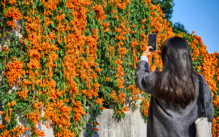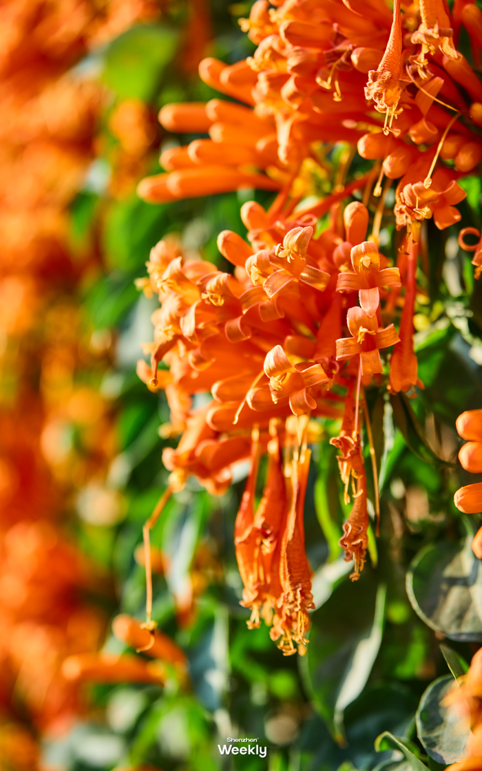 绵延数百米的橙红花墙沿着休闲步道蜿蜒展开,炮仗花攀附于廊架与围栏之上,串联成片,就像是天然“花廊”,非常壮观。漫步于此,还可以近距离感受花穗垂落的灵动之美。