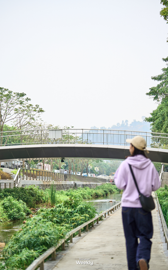 从铁岗水库西门出来,就可以来到宝安人熟悉的西乡河碧道,沿着步道散步放松。