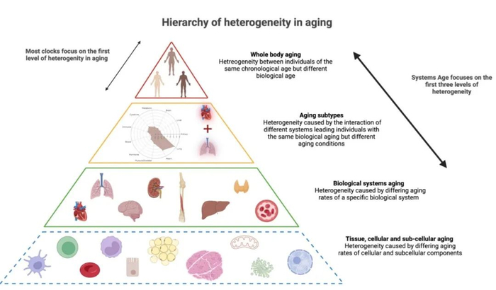图1. 从单一到多维度——表观遗传时钟的进化新阶段表观遗传时钟的发展经历了从简单预测整体生物年龄到功能特征、系统特异性分析的过程。最新的SYMPHONYAge(Systems Age)模型进一步深化了这一演化,通过同时评估多个器官或系统(如心脏、肺脏、肝脏和免疫系统等)的衰老速率,揭示了衰老过程的异质性与个体差异性,为实现更精准的健康风险评估和个性化干预打开了全新路径。(图片引用自:Sehgal R, 20235)