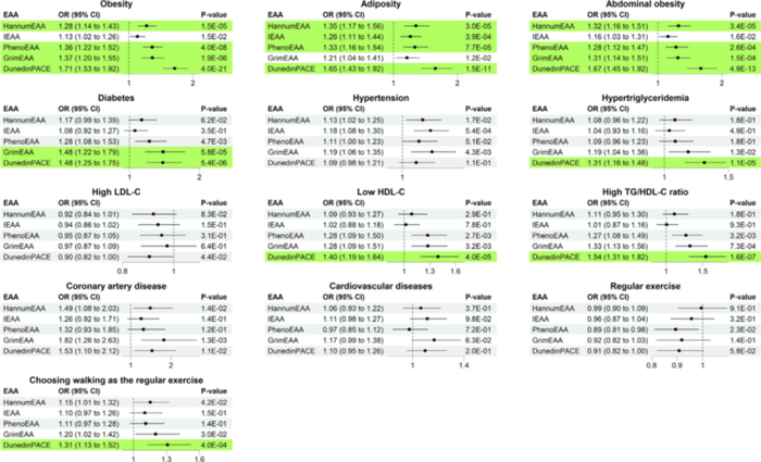 图2:海外经典时钟在亚洲人群健康指标预测中的表现差异(台湾地区队列)在对台湾地区人群进行验证后发现,不同经典表观遗传时钟模型(如Hannum、PhenoAge、GrimAge、DunedinPACE等)在预测肥胖、糖尿病、血脂异常(如高甘油三酯、高TG/HDL比值)等健康风险时表现各异。虽然DunedinPACE整体表现较优,但仍存在较大的泛化空间,提示我们亟需开发更适合亚洲(尤其是中国)人群特征的本土化表观遗传时钟模型。(图片引用自:Lin et al., 20236)