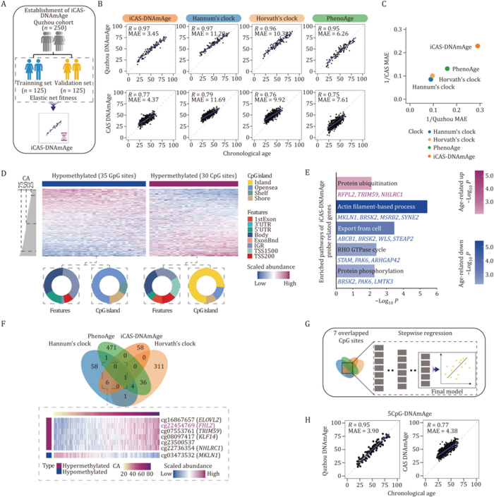 图3:中国人群甲基化时钟(iCAS-DNAmAge)的建模路径与模型精简方法示意图本图展示了iCAS-DNAmAge模型的开发和验证流程:(A) 模型构建采用来自中国南北两个地区人群的数据,并使用 elastic-net 回归法进行CpG位点选择与权重优化;(B,C,H) 显示了所开发时钟与实际年龄之间的预测效果;(D,E) 通过差异甲基化位点分析,识别并聚类出与年龄高度相关的关键CpG位点,并对其进行了功能注释;(F,G) 对比其他经典时钟(如Horvath, Hannum)模型的重合及差异位点,通过逐步回归的方式进行精简,最终得到适合临床转化的关键CpG位点组合;(H) 精简后的模型在多个中国人群队列中仍保持高预测准确性(相关系数0.95以上,MAE