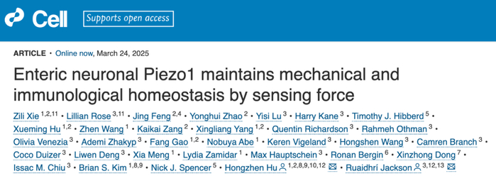 2025 年 3 月 24 日,西奈山伊坎医学院胡宏镇团队联合哈佛大学医学院 Ruaidhri Jackson团队,在国际顶尖学术期刊 Cell 上发表了题为:Enteric neuronal Piezo1 maintains mechanical and immunological homeostasis by sensing force的研究论文。