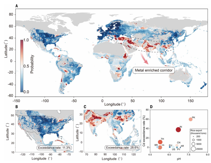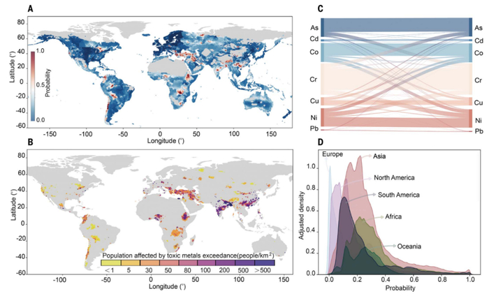 该研究分析了砷、镉、钴、铬、铜、镍和铅造成的全球土壤污染期刊,并绘制了超过农业和人类健康阈值的有毒金属污染地区,揭示了一个此前未被识别的低纬度欧亚大陆高风险金属富集区,该研究显示,全球约有 14%-17% 的耕地土壤受到有毒金属污染影响,并估计有 9亿-14 亿人生活在超过人类健康和生态阈值的有毒金属污染区域。