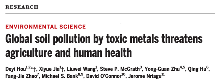 2025 年 4 月 17 日,清华大学环境学院侯德义教授团队在国际顶尖学术期刊 Science 上发表了题为:Global soil pollution by toxic metals threatens agriculture and human health 的研究论文。