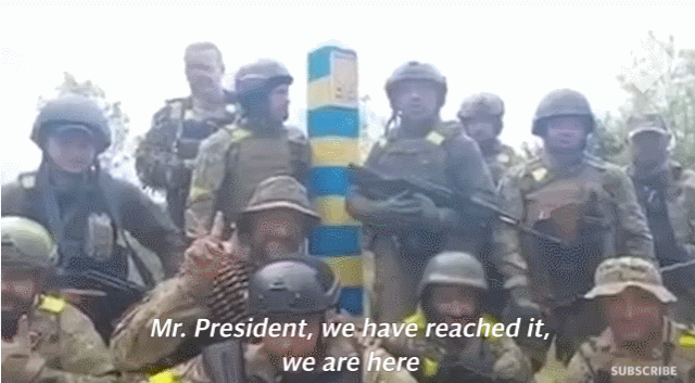 2022年5月份,乌军在哈尔科夫方向实施了一波连续反击,3天时间就把战线推进了40公里,然后网上就出现了一则视频:乌克兰士兵簇拥着一座印着乌克兰国旗界碑合影,激动地给总统汇报说他们已经打到了俄罗斯边境,赶走了俄军。