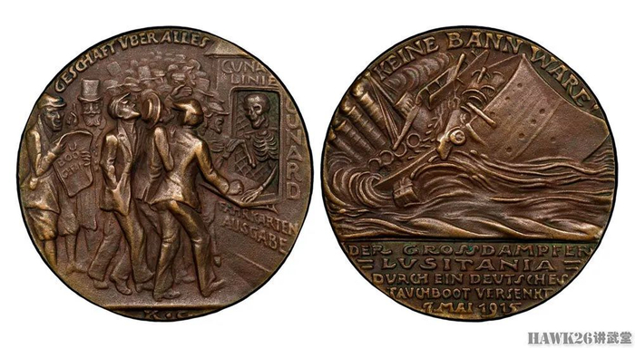 击沉“卢西塔尼亚”号邮轮后,德国铸造了一批极具讽刺意味的纪念章。一侧是出售船票的死神,另一侧则是邮轮的沉没。