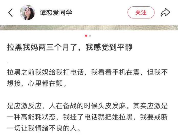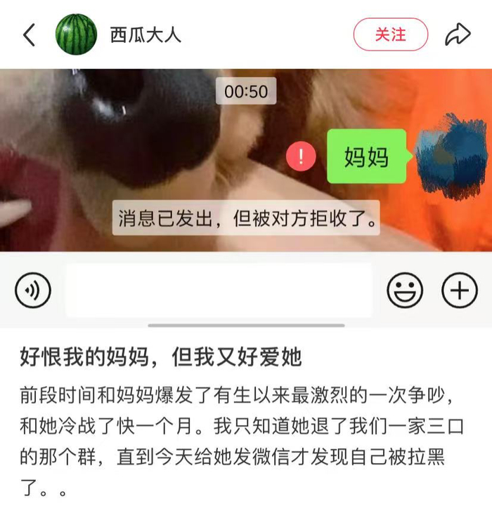 一位网友因为吵架被母亲拉黑,就在快要说服自己“断就断”的情况下,她对妈妈的爱又一次冒出来,这种爱恨交织让她十分痛苦。