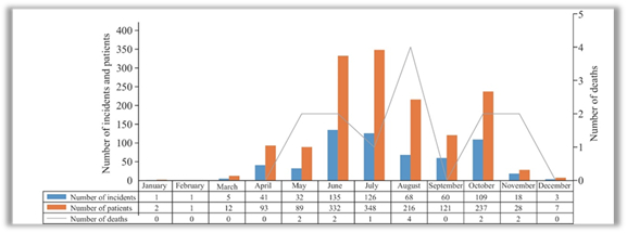 中国西南地区(四川、云南、贵州和重庆)受影响最严重,共发生321起事件,882名患者,9人死亡;其次是中部长江流域地区(湖南、湖北、河南和江西),共发生126起事件,235名患者,1人死亡;华东地区(浙江、安徽、江苏、福建和上海)报告了59起事件,130名患者,1人死亡;其余地区无死亡病例。