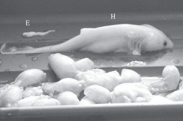 但是卵黄囊总有用光的那一天,到了那个时候。鼠鲨类的胎儿就会迎来一场子宫里的“吃鸡大赛”。每个第一个长到10厘米的胎儿会将同一个子宫里的其它兄弟姐妹全部咬死吃掉,以获得自己生长发育所需的营养。