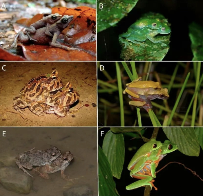 不同种类的蛙类抱对,可见都是上面的公蛙比下面的母蛙小