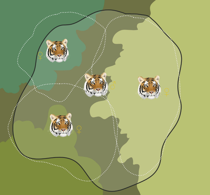 在野外,老虎会划分自己的领地,雄虎的领地范围往往会覆盖 3~4 头雌虎的领地,少数强悍雄虎甚至更多。这些雌虎都是雄虎的伴侣,只不过它们平时各过各的。