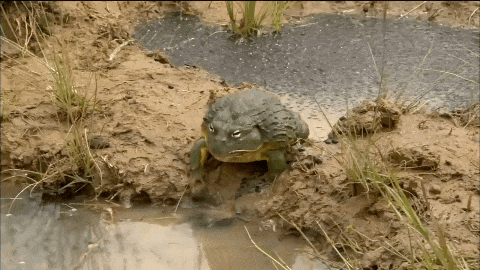 除了这些,非洲牛蛙还要面对气候的威胁,在它们生活的非洲草原上的水潭往往面临着蒸发枯竭的问题。这时候蛙爸爸的巨大体型就要派上用场了,它们会用强壮的身体拱开泥土制造“水渠”,把更大水潭里的水引到小蝌蚪们生活的水潭。