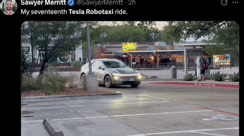 很多体验者都反复提到的一个亮点是,特斯拉Robotaxi接送客十分灵活,可以自主跑进停车场内部接送,不需要乘客在路边等候上下车: