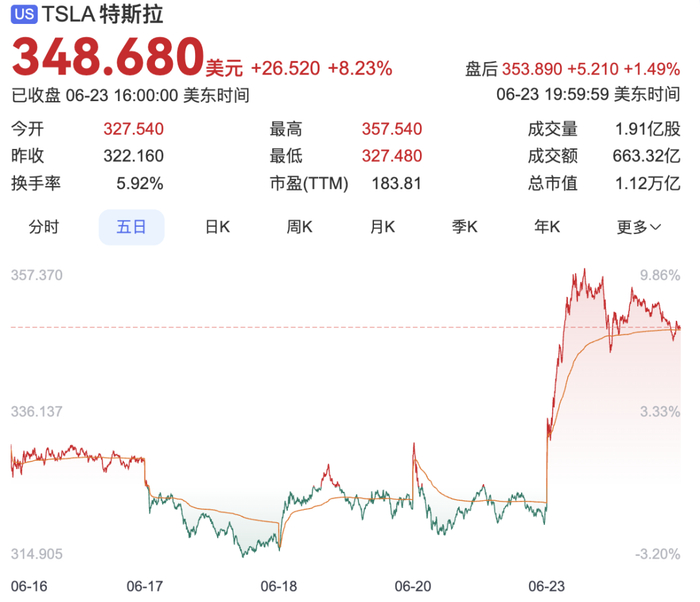 特斯拉Robotaxi官宣上路后,股价一路猛涨,大涨超8%: