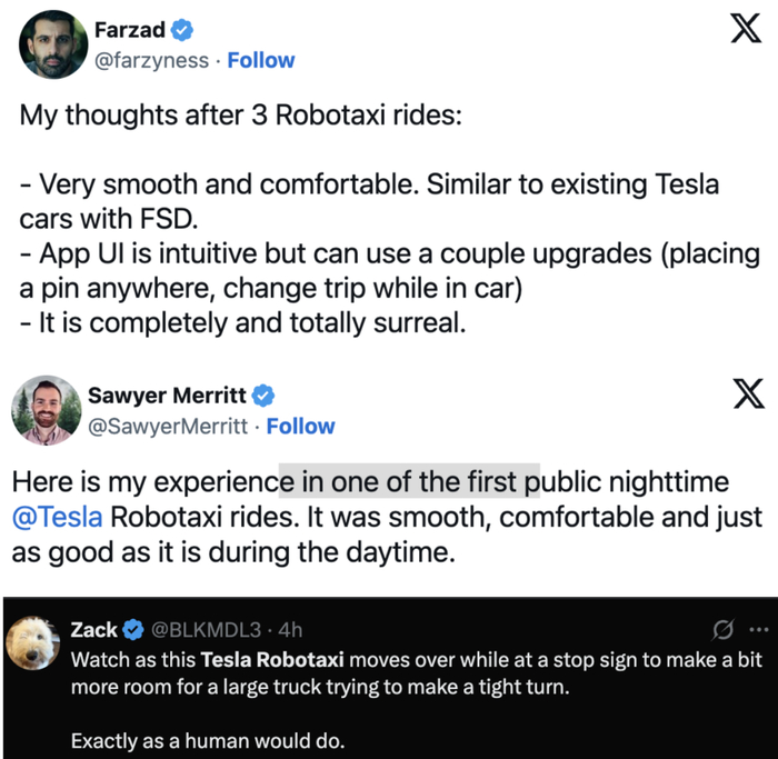 这会在X上搜索“Tesla Robotaxi”,出现的是几乎100%一边倒的正向舆论。