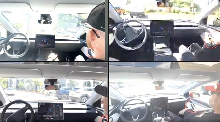 以及还有细心的网友发现,尽管主驾无人,但特斯拉在副驾上配的“安全员”,所有人无一例外右手都紧握门把手,猜测内部可能是一个“紧急退出”的按钮:
