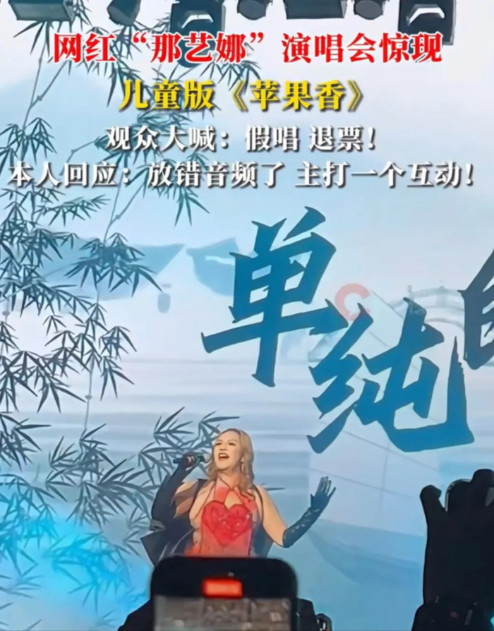 当杭州演唱会因音响师的失误播放了童声版《苹果香》,那艺娜张口就是清脆的六岁童音,现场观众齐声喊起“退票”。