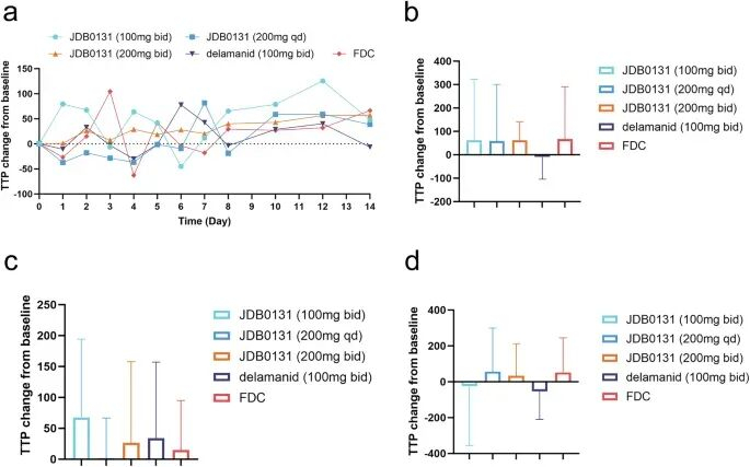 结果表明,所有三个剂量的JDB0131组在延长培养阳性时间方面均优于德拉马尼组,阳性时间延长意味着细菌代谢活性降低,其中200毫克每日两次组效果最为突出,整体数据显示JDB0131能够更快地抑制结核菌生长,各治疗队列的TTP变化通过连续监测曲线和分组柱状图进行了系统比较。