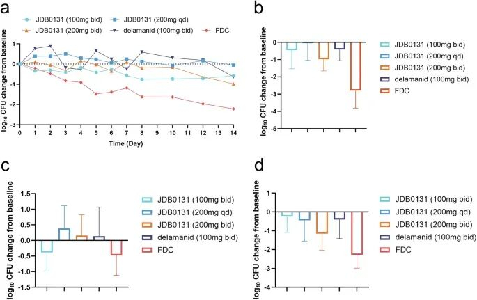 图中显示,所有JDB0131剂量组的早期杀菌活性均优于德拉马尼组,尤其是200毫克每日两次组在第0至14天时间段内表现出最为显著的细菌载量下降效果,尽管固定剂量联合用药组在期末的细菌负荷最低,但JDB0131整体展现出更优的杀菌效能,各组数据以连续曲线和柱状图形式直观对比了不同时间段的下降幅度。