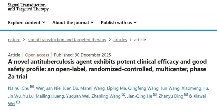 四川大学魏霞蔚研究员、丁振宇教授、贺建清教授、武汉市肺科医院王震玲研究员和首都医科大学初乃惠教授等人开发了德拉马尼的结构优化产物JDB0131——这种第三代硝基咪唑类药物在临床前研究中展现出更优的药代动力学特性、良好的口服吸收与剂量依赖性暴露,并在GLP毒理研究中实现了关键安全性突破:未观察到QT间期延长。相关内容以“A novel antituberculosis agent exhibits potent clinical efficacy and good safety profile: an open-label, randomized-controlled, multicenter, phase 2a trial”为题发表在《Signal Transduction and Targeted Therapy》上。