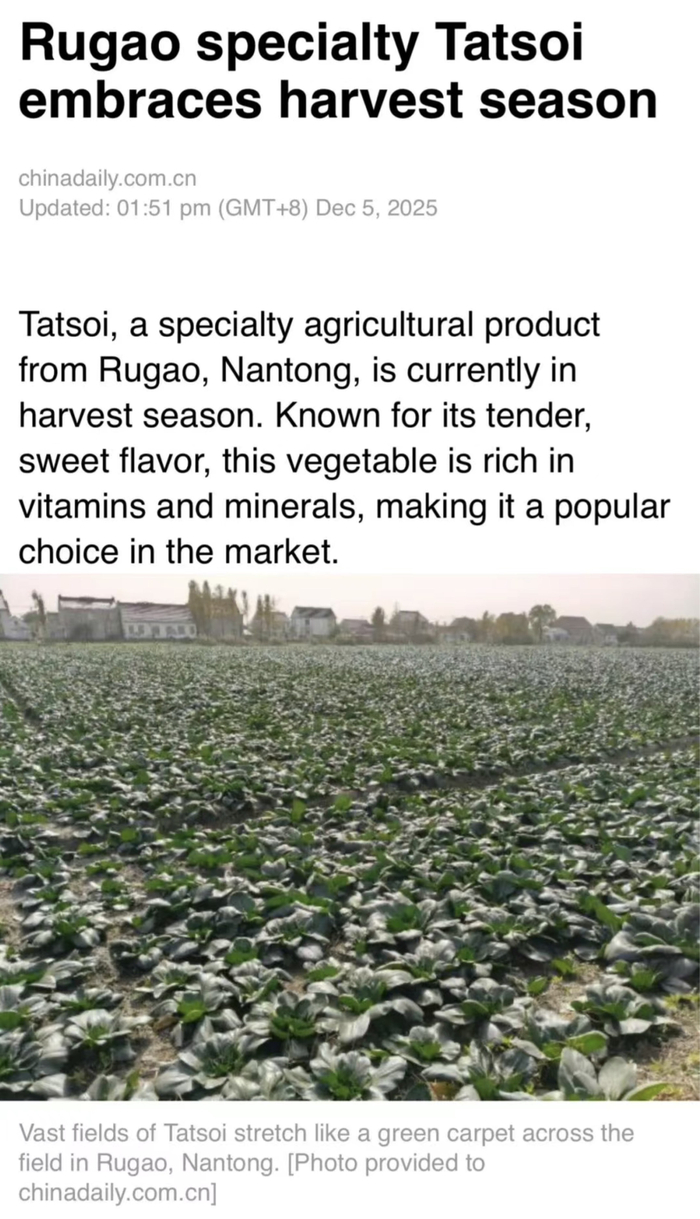 12月初,中国日报英文版China Daily在一篇文章里专门介绍了黑塌菜(Tatsoi):一种南通如皋的特色农产品,有鲜嫩甜美的口感,富含维生素和矿物质。