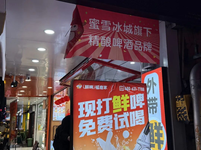 无论是外在形象还是运营方式,福鹿家的“画风”都与蜜雪冰城高度相似。红底白字的高亮度招牌、循环播放的主题曲《欢乐星期五》;在定价上,福鹿家延续了蜜雪系一贯的平价路线,大部分产品售价集中在5.9-9.9元/500ml,最贵的一款鲜啤产品售价为12.9元/500ml。