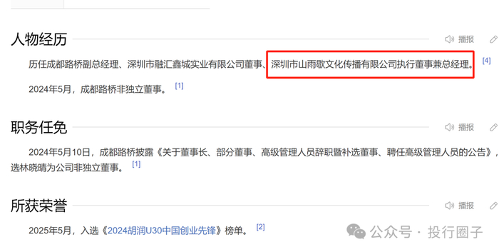 林晓晴出生于 1996 年,拥有硕士研究生学历。根据相关公告,在担任成都路桥董事长之前,她曾任公司副总经理,同时在深圳市融汇鑫城实业有限公司、深圳市山雨歇文化传播有限公司等企业担任重要职务。