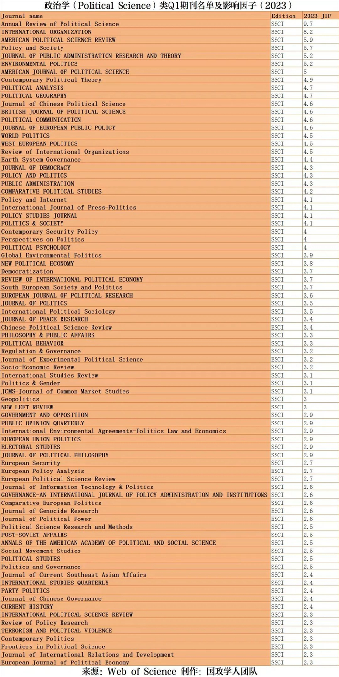 在政治学类期刊中,有317本SSCI和ESCI期刊入选,包括187本SSCI期刊和128本ESCI期刊。排名前三的期刊为《政治学年鉴》(Annual Review of Political Science)、《国际组织》(International Organization)和《美国政治学评论》(American Political Science Review),影响因子分别是9.7、8.2和5.9。复旦大学国际关系与公共事务学院主办、施普林格自然(Springer Nature)出版社出版的ESCI期刊《中国政治学评论》(Chinese Political Science Review)影响因子为3.4,在317本政治学类期刊中排名第38位(位居Q1区)。