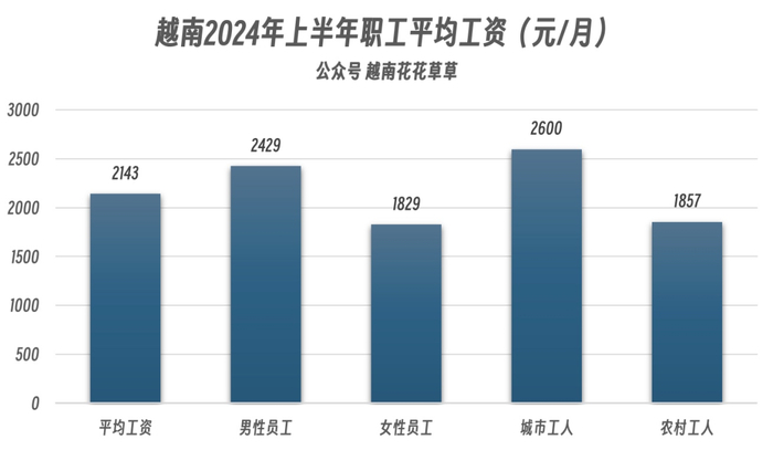 其中,男性员工的平均收入为850万越南盾(2429元)/月,女性员工的平均收入为640万越南盾(1829元)/月;城市地区工人的平均收入为910万越南盾(2600元)/月,农村地区工的平均工资为650万越南盾(1857元)/月。