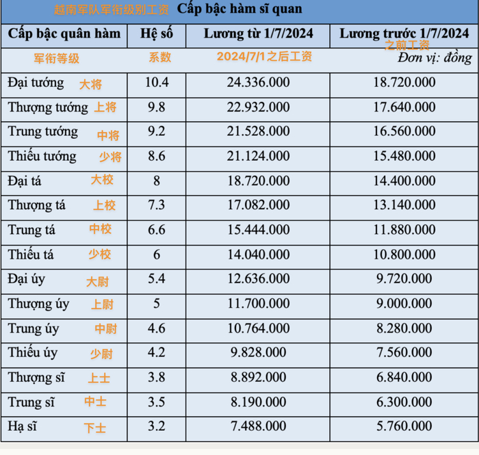根据公布的薪资,军队当中大将的工资最高,超过2430万越南盾(6943元),不包括津贴,最低的是国防工人的630万越南盾(1800元)。