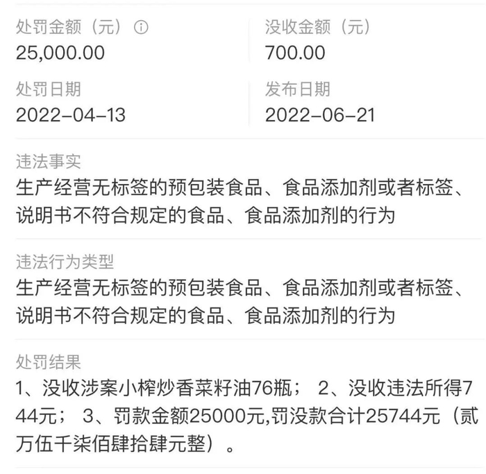 我查到他们2022年被行政处罚的公告,说是生产无标签的预包装食品,最后被没收了76瓶菜籽油: