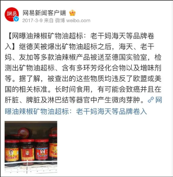 原来,优恪网选择了市面上10款畅销油辣椒产品送德国去检测,结果老干妈、海天、老干爹等产品里“莫名其妙”混入了矿物油。